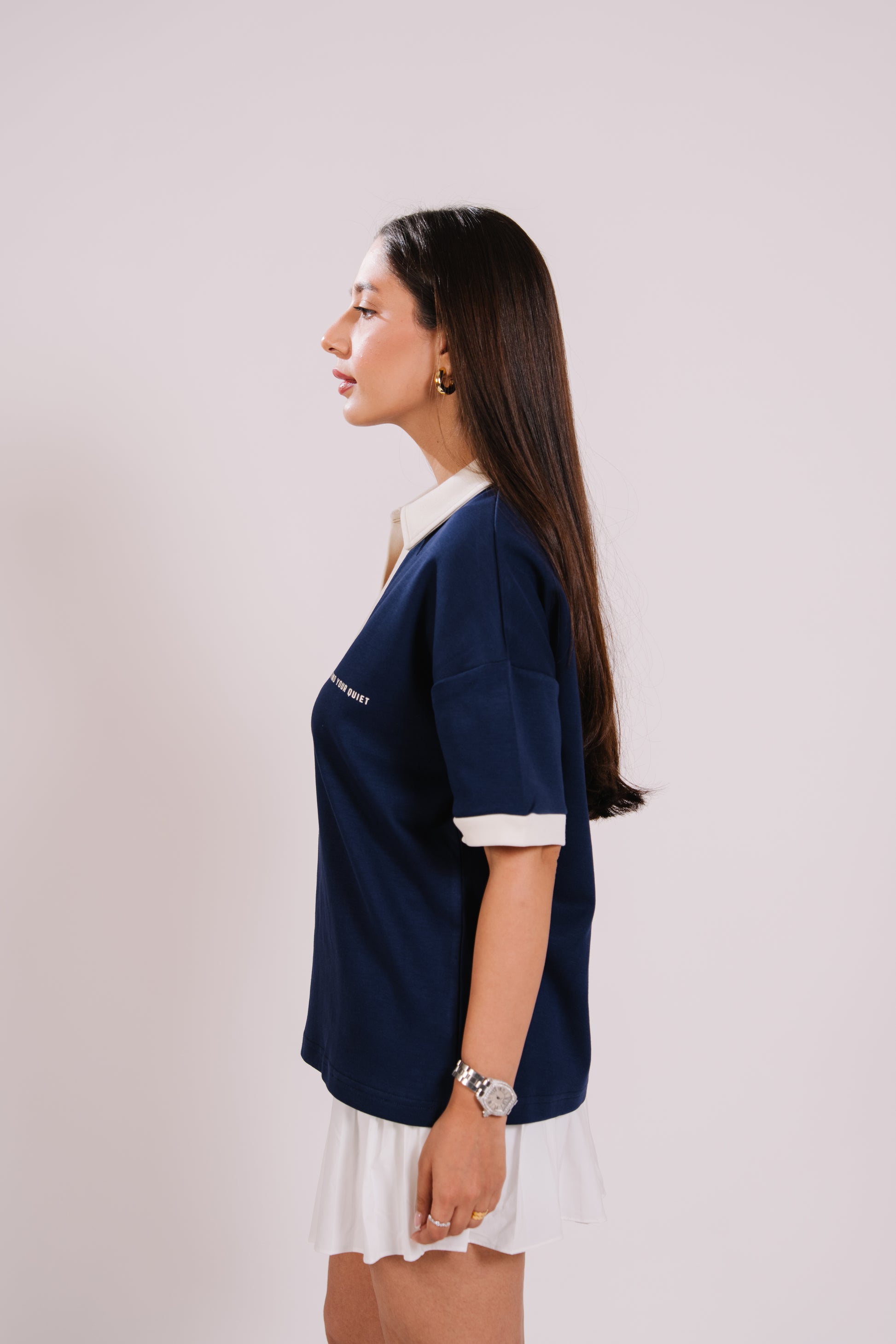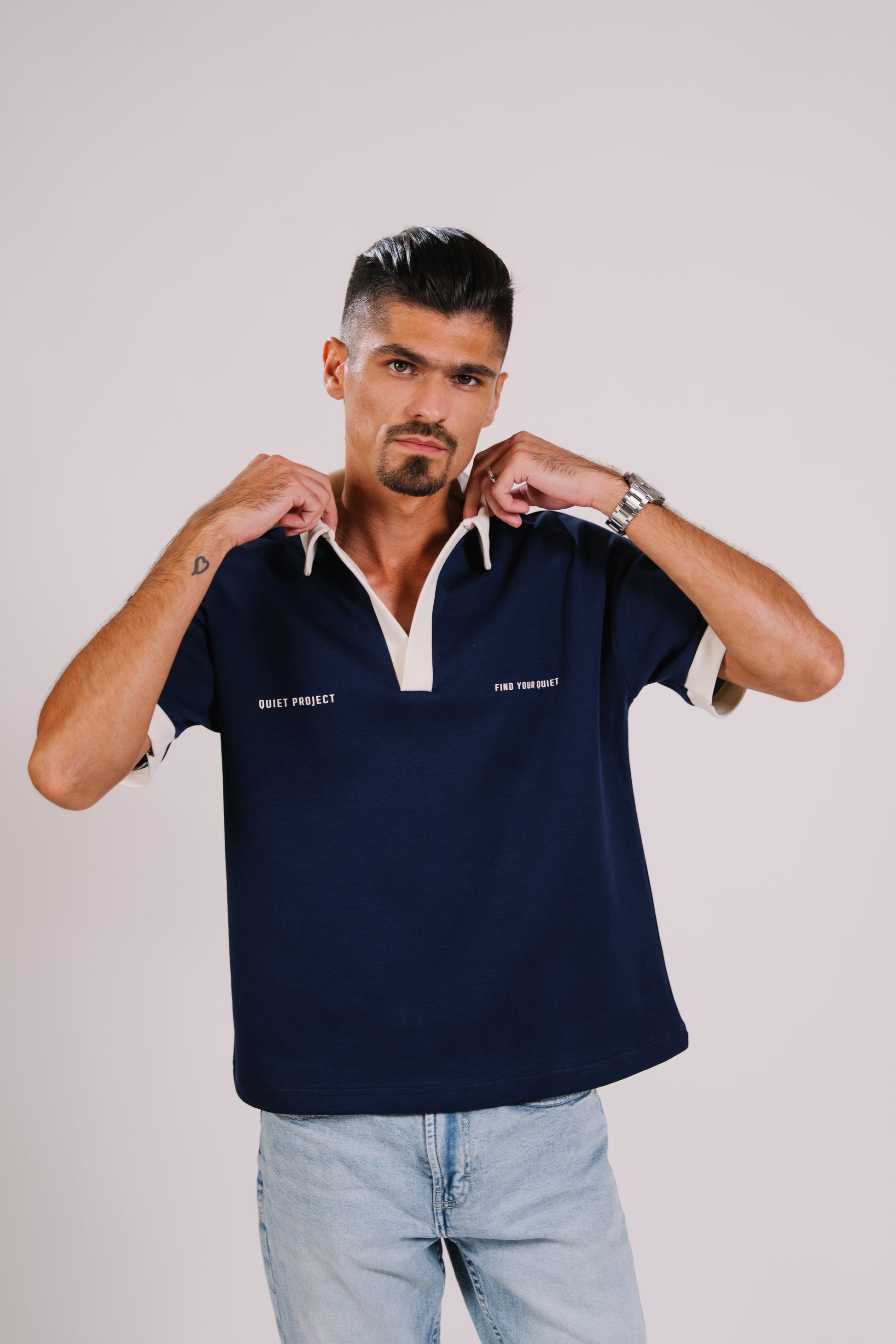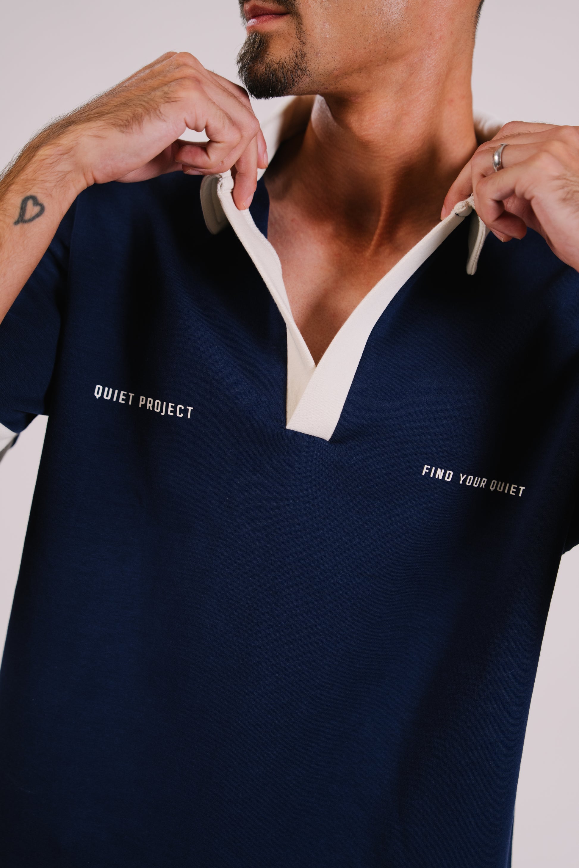 The Clubhouse Polo pairs classic sport heritage with contemporary minimalism. Featuring refined contrast detailing, an antique white collar, placket, and sleeve hems against a deep blue body. Dual silicone-printed logos, "Find Your Quiet" and "Quiet Project", sit cleanly on either side of the chest, balancing subtle branding with timeless design.