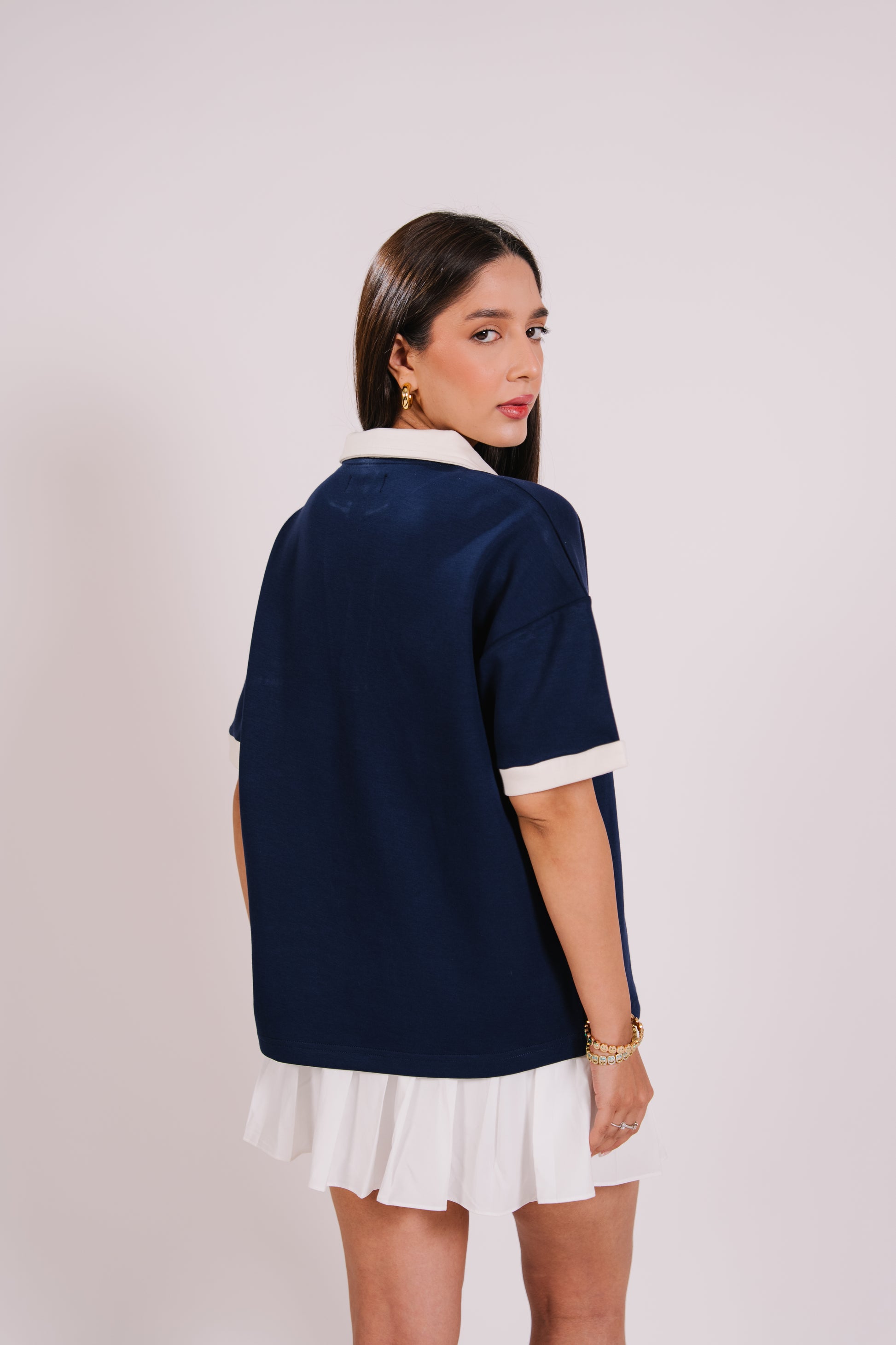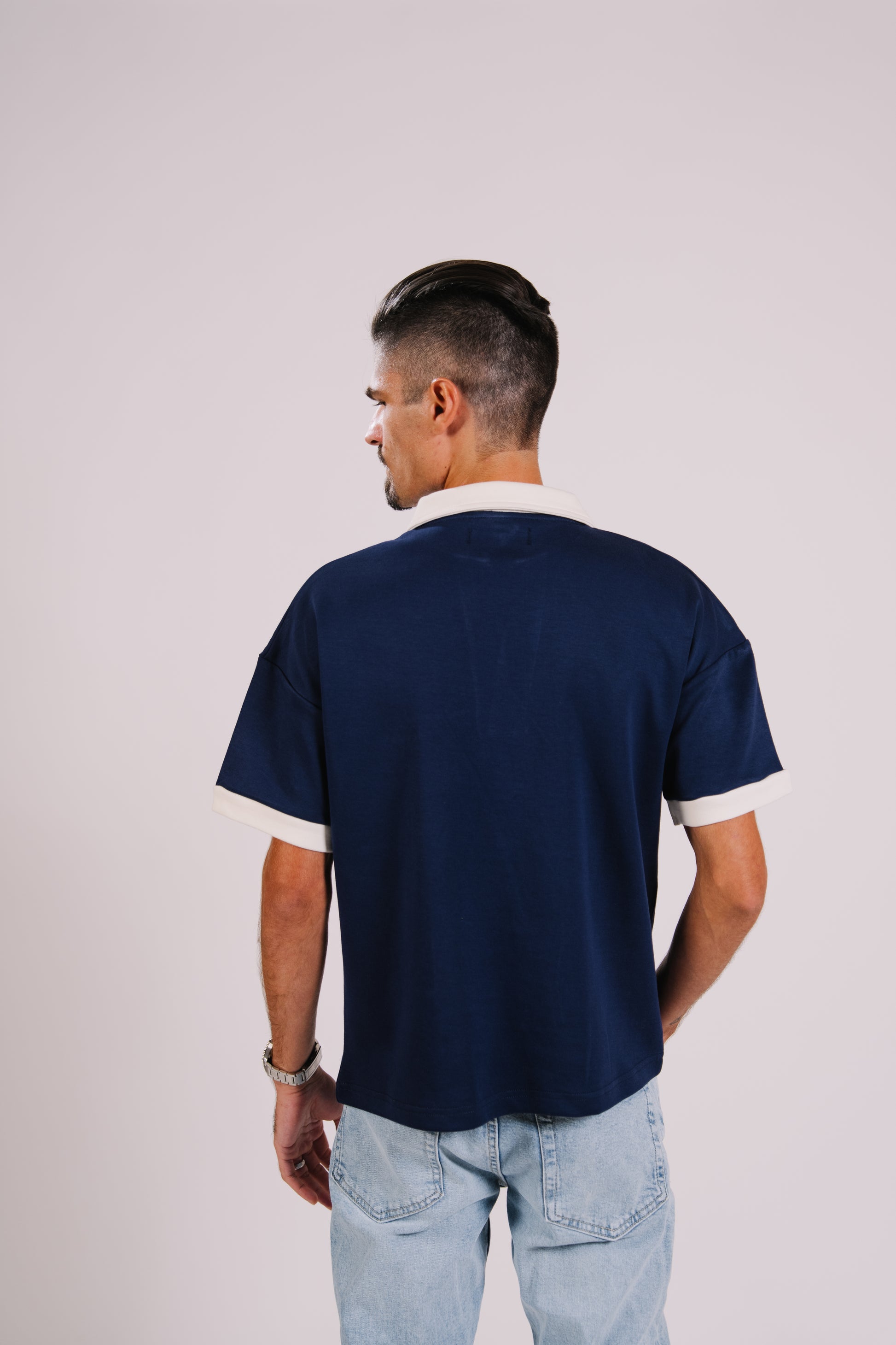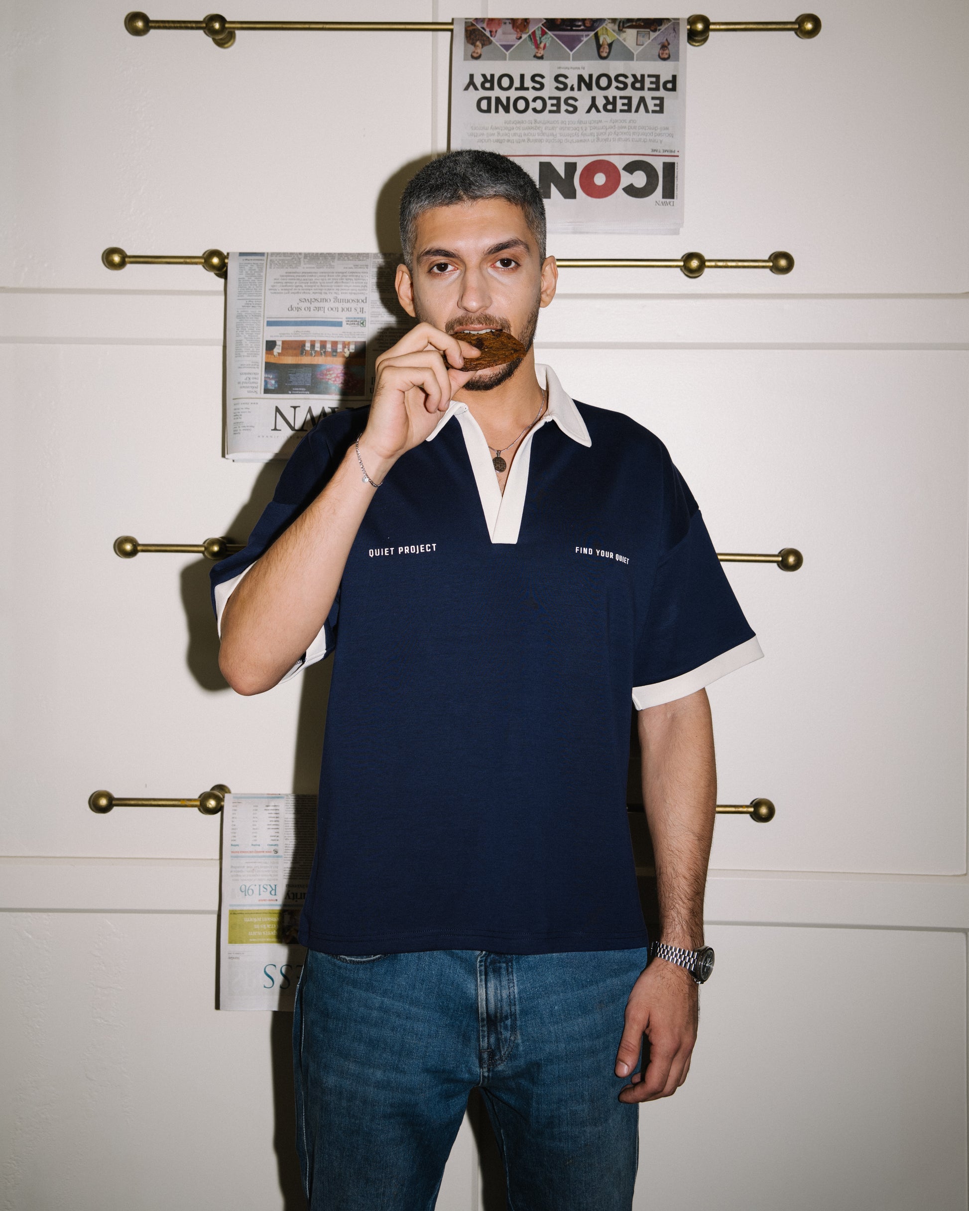 The Clubhouse Polo pairs classic sport heritage with contemporary minimalism. Featuring refined contrast detailing, an antique white collar, placket, and sleeve hems against a deep blue body. Dual silicone-printed logos, "Find Your Quiet" and "Quiet Project", sit cleanly on either side of the chest, balancing subtle branding with timeless design.