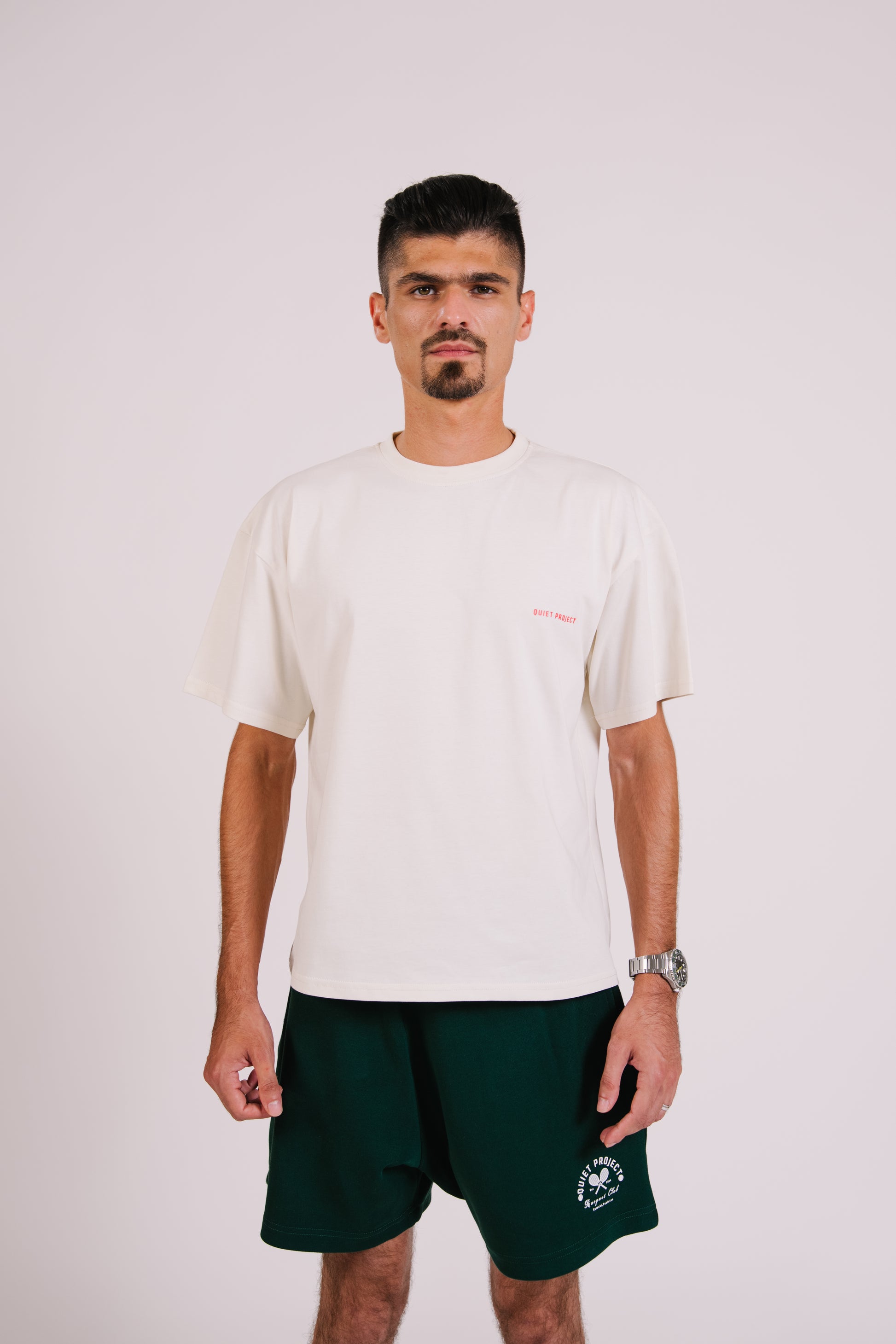 The front features a minimal Quiet Project silicone typeface on the left chest, while the back showcases the signature Racquet Club court graphic, screen-printed in bold contrast.